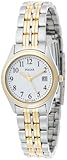 Movimento al quarzo, vigilanza del vestito, Gold-tone mani luminose, Gold-tone dot indici, numeri e indici neri dot, datario analogico, in acciaio inox lucido lunetta in oro-tono, caso silver-tone in acciaio inox satinato / lucido, acciaio inox lucido color oro corona e d'argento-tono fondello, vetro minerale, resistente all'acqua